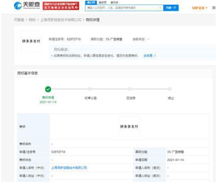 近期,拼多多关联公司上海寻梦信息技术有限公司新增一项“拼多多支付”商标申请信息,国际分类涉及35-广告销售,商标状态显示为“商标申请中”。