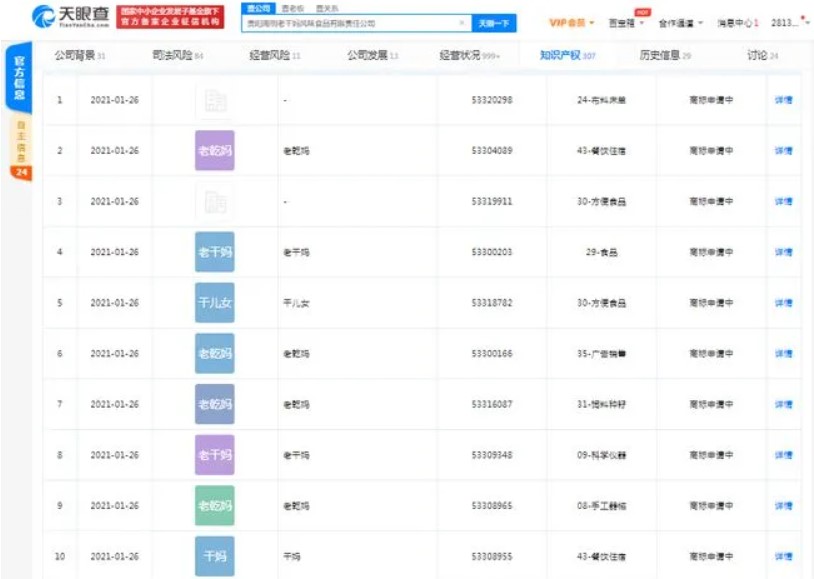 近日,天眼查App显示,贵阳南明老干妈风味食品有限责任公司新增多条 "老干妈 " "老乾妈 " "妈干老 " "老姨妈 " "干妈 " "陶华碧 " "陶老干爸 "等商标信息,国际...